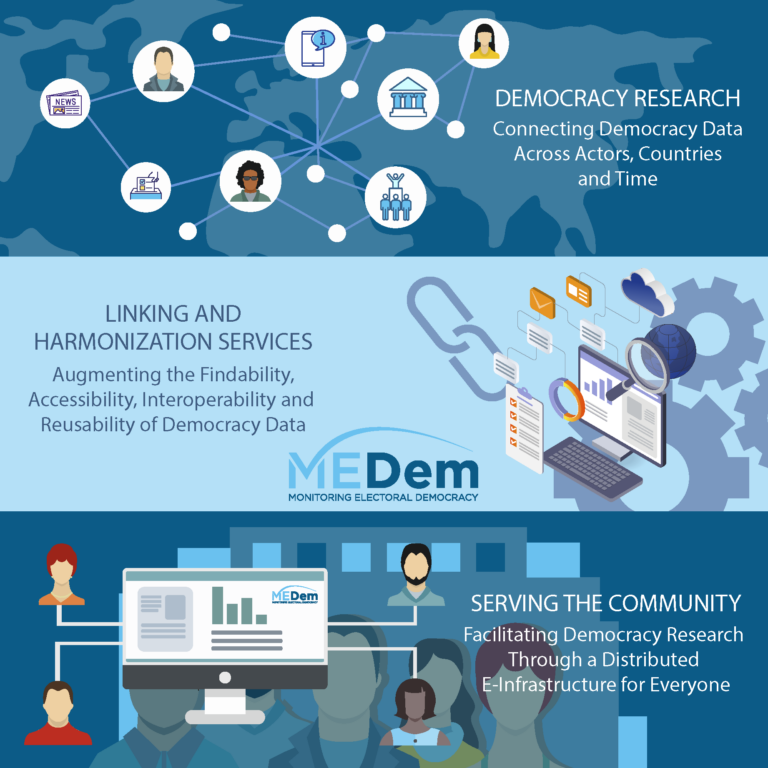 Monitoring Electoral Democracy (MEDem) is a distributed European research infrastructure that will enable better, more comprehensive, and highly innovative comparative democracy research on electoral democracies by bringing together and linking data sources on the functioning of democracies, and by building standards and instruments for data collection and analysis.